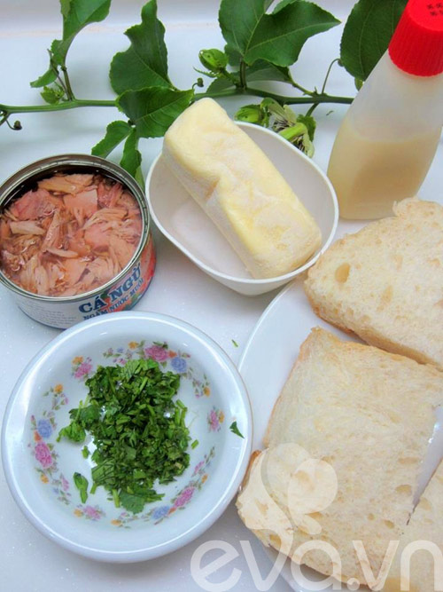 Bước 1: Cá hộp chắt bỏ nước, lấy phần thịt cá, tán nhuyễn phần cá này, thêm 1 muỗng canh hành lá hoặc ngò cắt nhuyễn, ¼ muỗng café tiêu, ¼ muỗng café muối, 2 muỗng canh mayonnaise điều trị ho tràng phục linh. Trộn đều. Phô mai mozzarella cắt lát hoặc mài nhuyễn. Xẻ đôi bánh mì theo chiều dọc, cắt miếng vừa ăn.